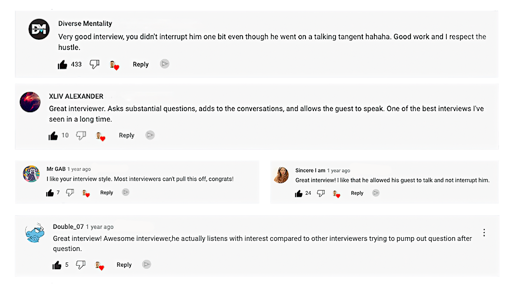 I've written about how to have better conversations for Time, and my interviews have been shared in Forbes, Entrepreneur, Rolling Stone, Esquire, Complex, and others.Mike Tyson, 50 Cent, and I shared laughs. We spoke for hours. Jake Paul and I faced off at his house in Puerto Rico.Floyd Mayweather and I spoke (on camera with his 40+ person entourage in tow, watching us) and over 4M people worldwide have watched my conversations on YouTube.